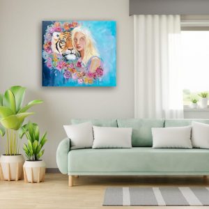 Eine ruhige Figur mit fließendem, blondem Haar blickt nachdenklich – ihr Ausdruck ist zugleich einladend und geheimnisvoll. An ihrer Seite ruht ein majestätischer Tiger, dessen wilder Blick durch ein üppiges Arrangement lebendiger Blumen gemildert wird.