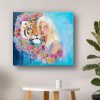 Eine ruhige Figur mit fließendem, blondem Haar blickt nachdenklich – ihr Ausdruck ist zugleich einladend und geheimnisvoll. An ihrer Seite ruht ein majestätischer Tiger, dessen wilder Blick durch ein üppiges Arrangement lebendiger Blumen gemildert wird.