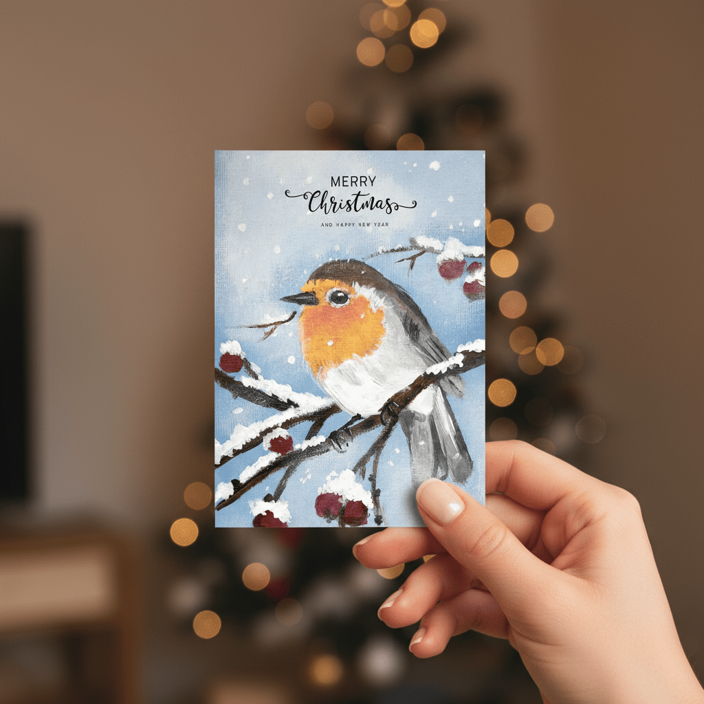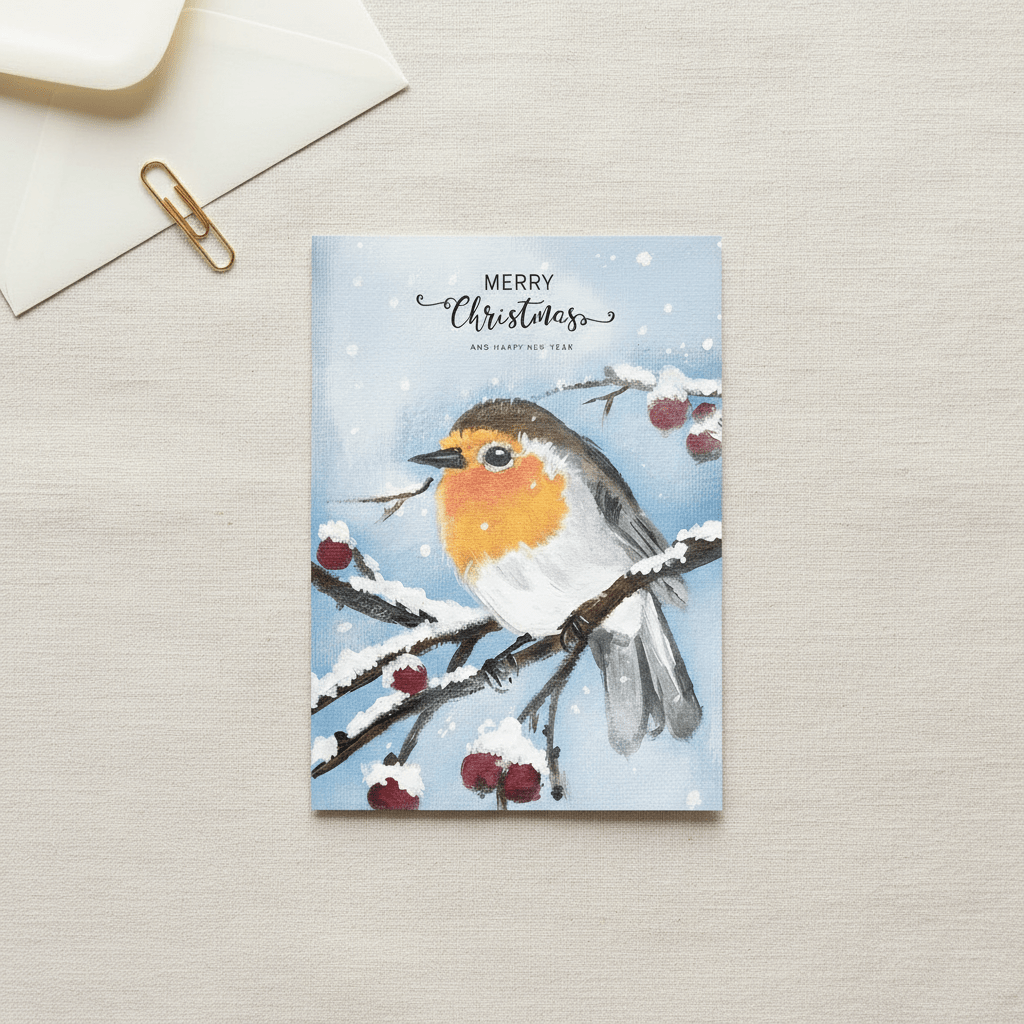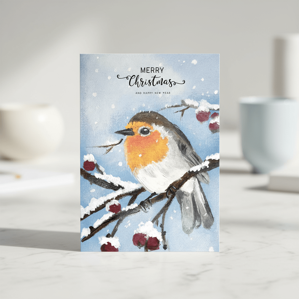 Stimmungsvolle Weihnachts-Postkarte mit handillustriertem Rotkehlchen auf verschneitem Zweig, roten Beeren, sanftem Schneefall und „Merry Christmas“-Lettering – perfekt für festliche Grüße oder winterliche Deko.